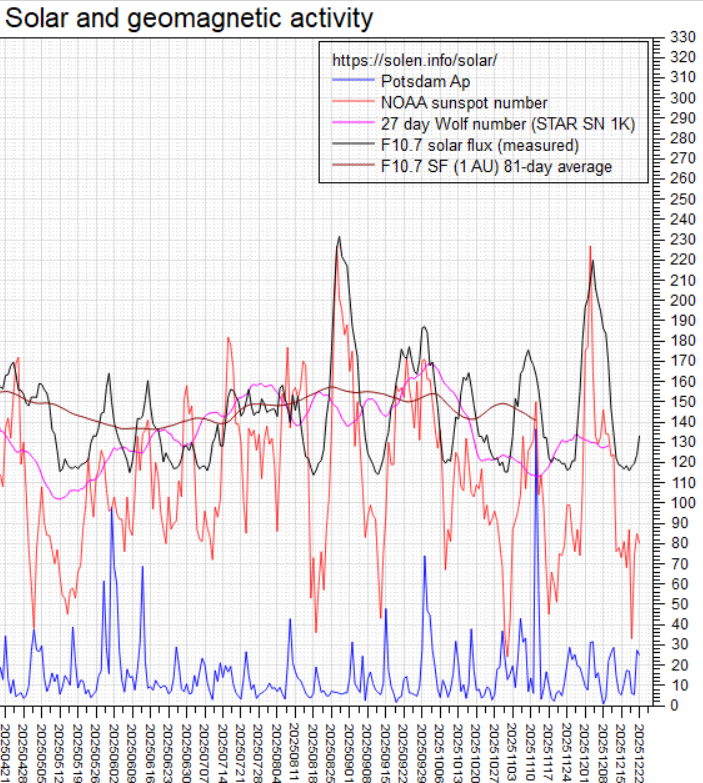Every December through January every year we enter into a region near the Sun where we are exposed to a higher proportion of x-rays, due to the Sun ionizing gases. 3i/ATLAS is in our inner solar system right now, emitting a large amount of gas which is adding to the ionization by the Sun and thus the x-ray load to which we are being exposed. It reached its closest approach to the Earth on the 19th. This energy will peak right after the solstice two days later. Along with this we have a historic planetary alignment that is taking place involving the alignment of the Sun, Venus, Mars and the Earth opposite Jupiter, aligned with the Galactic Center. Last time we saw this was in 1936, which will have relevance later on in this letter. The alignment with the Galactic Center also exposes us to more x-rays and gamma rays and high-energy cosmic particles. Then along with that, we have the Saturn/Neptune conjunction at the Aries point, 0° Aries, which will be explained more around the time of that event in early February. We also have the Geminid (13, 14), Ursids (20, 21) and Quadrantid (3, 4 Jan) meteor showers. And finally, we see the increased activity of the Sun, mentioned at the first part of this letter. 2025 marks the solar maximum, which may this time result in a double maximum.